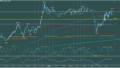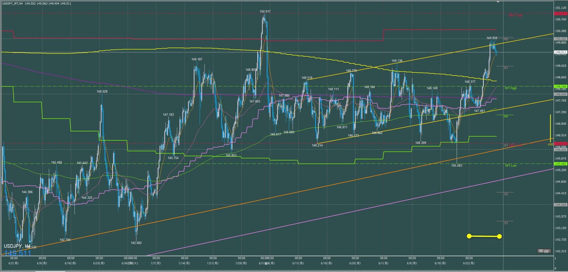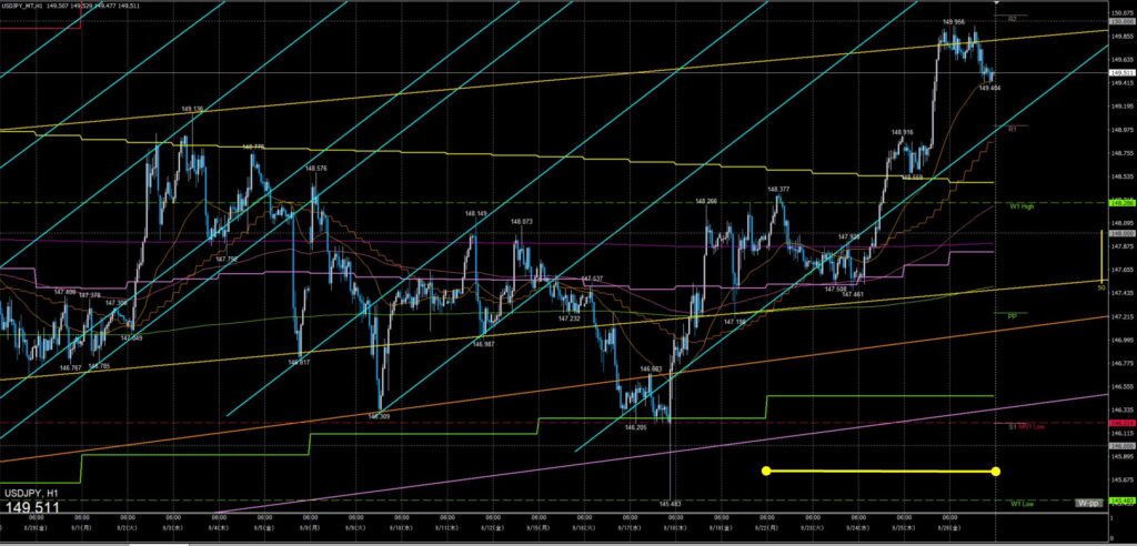 月曜火曜は下へ、上昇レンジチャネル安値手前の日足SMA21が強力にサポートして水曜日に反転上昇、木曜日にチャネル高値に達し金曜日は150円手前の149.96円で天井感。