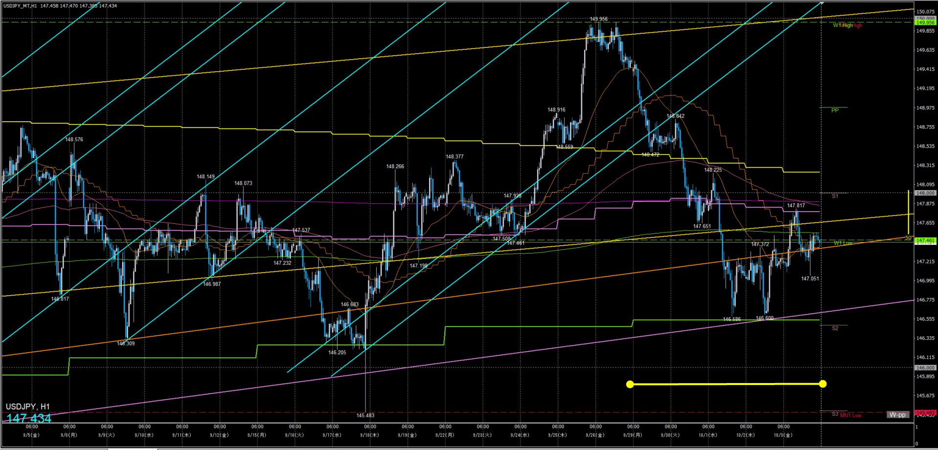 先週到達した4時間上向きレンジチャネルの高値のクラスターからの下降を月曜日から継続し水曜日にはチャネル安値を下抜けし日足切り上げライン146.5円に到達。木曜日に日足切り上げラインにダブルボトムをつけて金曜日にネックラインを上抜けして反転上昇気配も日足SMA21にレジスタンスされてダブルボトムへの下値だめしの雰囲気でクローズ。