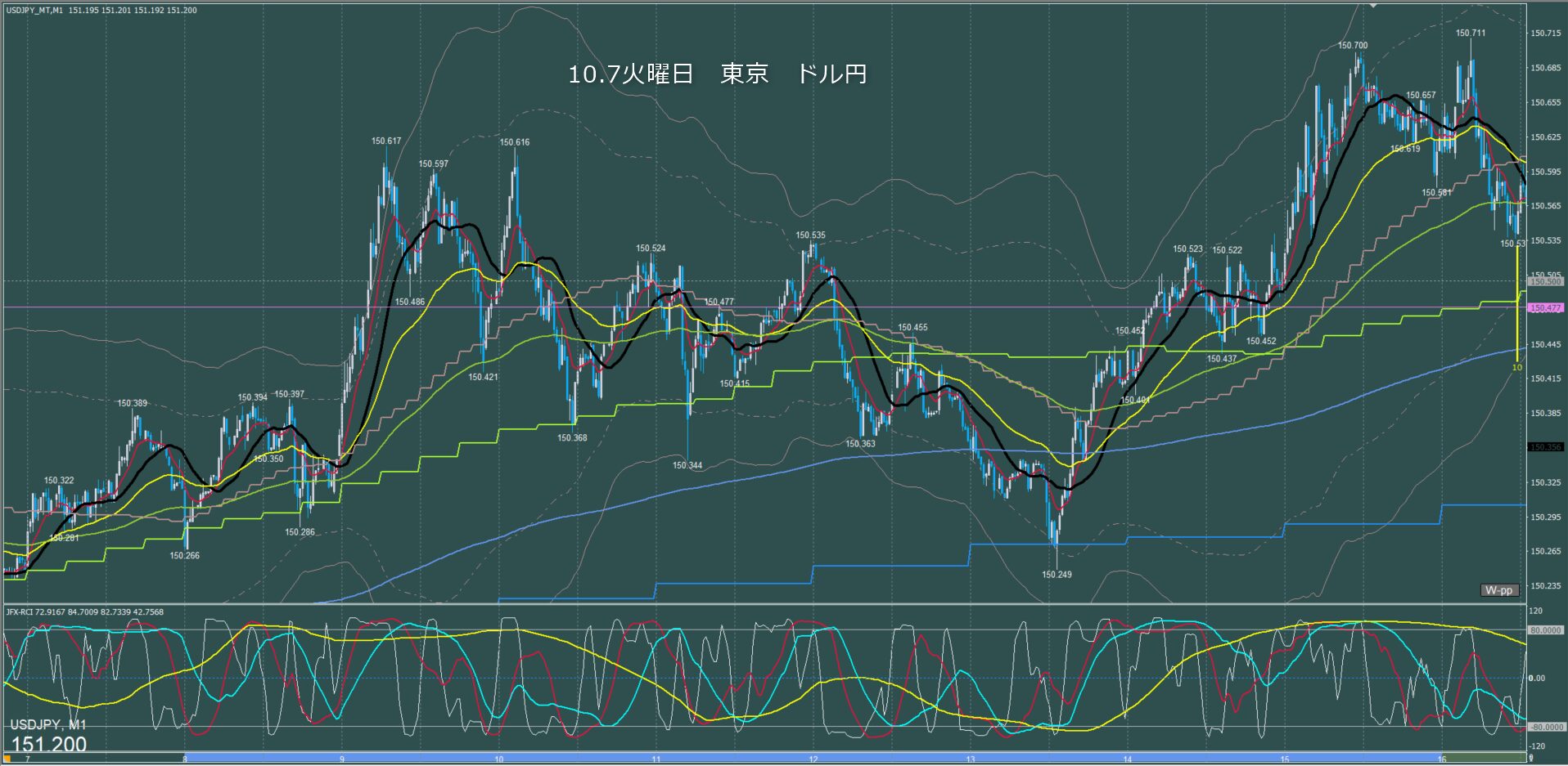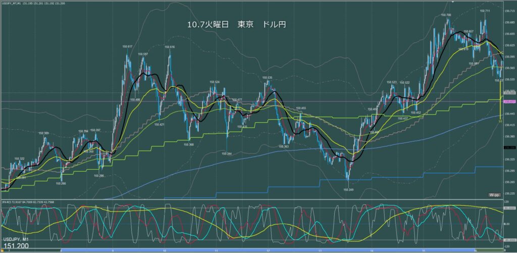 東京時間~ロンドン初動 ドル円1分足チャート 火曜日 10月7日