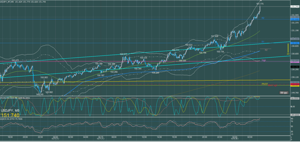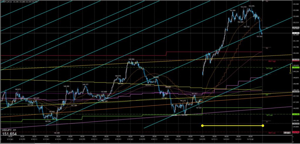 自民党の新総裁に高市早苗が選ばれ窓開けスタート、その後も上昇を続ける高市トレードで金曜日オセアニア時間に高値153.276円をつけるがその後弱まり24時にトランプ大統領の対中国関税発言で151.5円まで急落した。