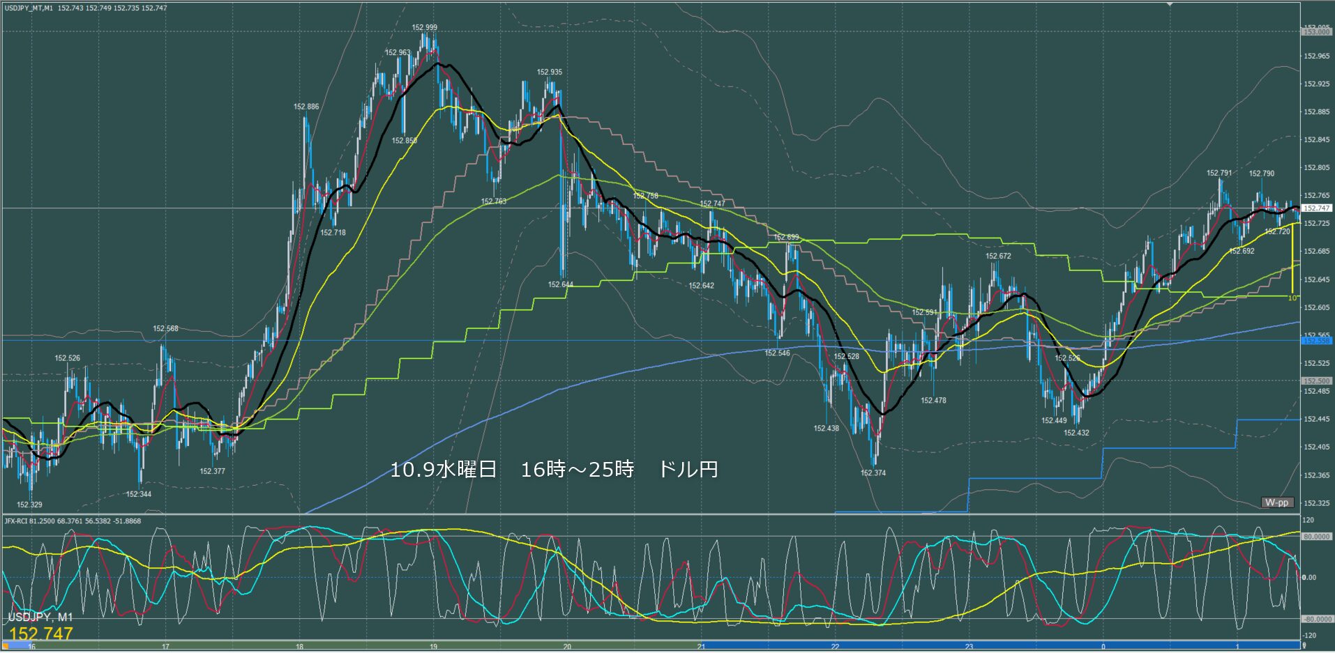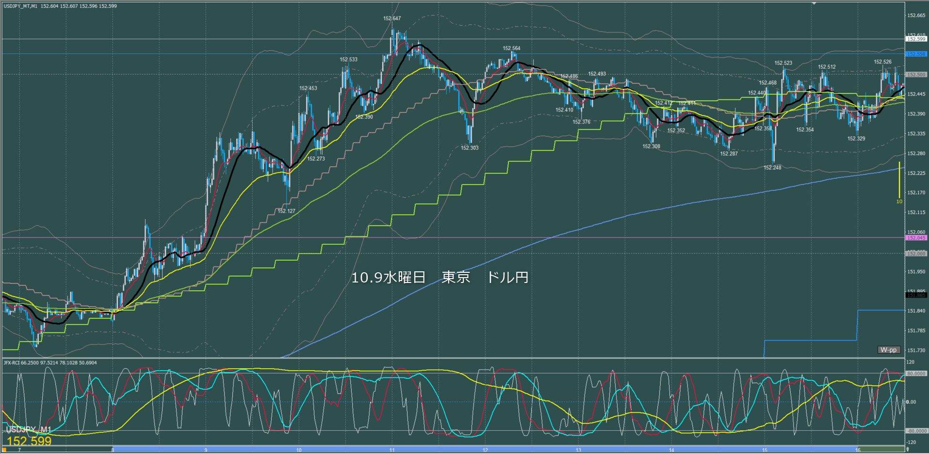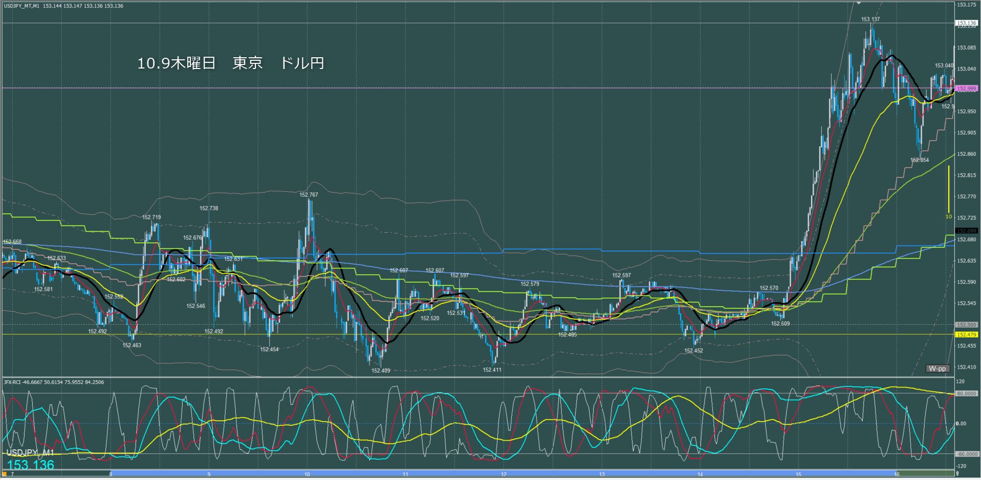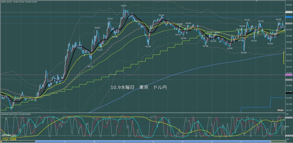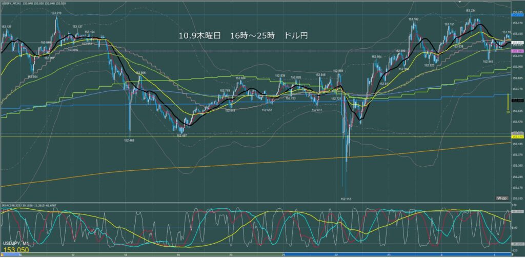 東京時間~ロンドン初動 ドル円1分足チャート 木曜日 10月9日