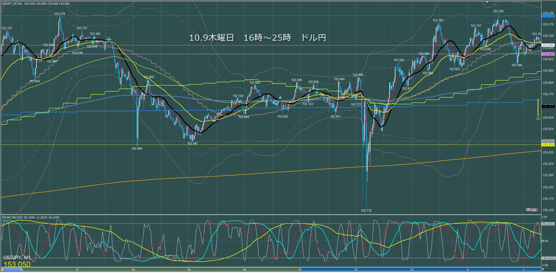 ロンドン~ニューヨーク ドル円1分足チャート 木曜日 10月9日