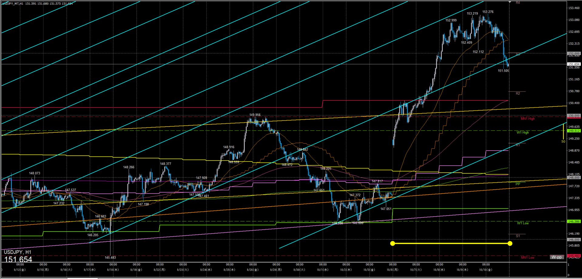 ドル円 一週間の動き 1時間足 2025年10月6日~10日週 検証