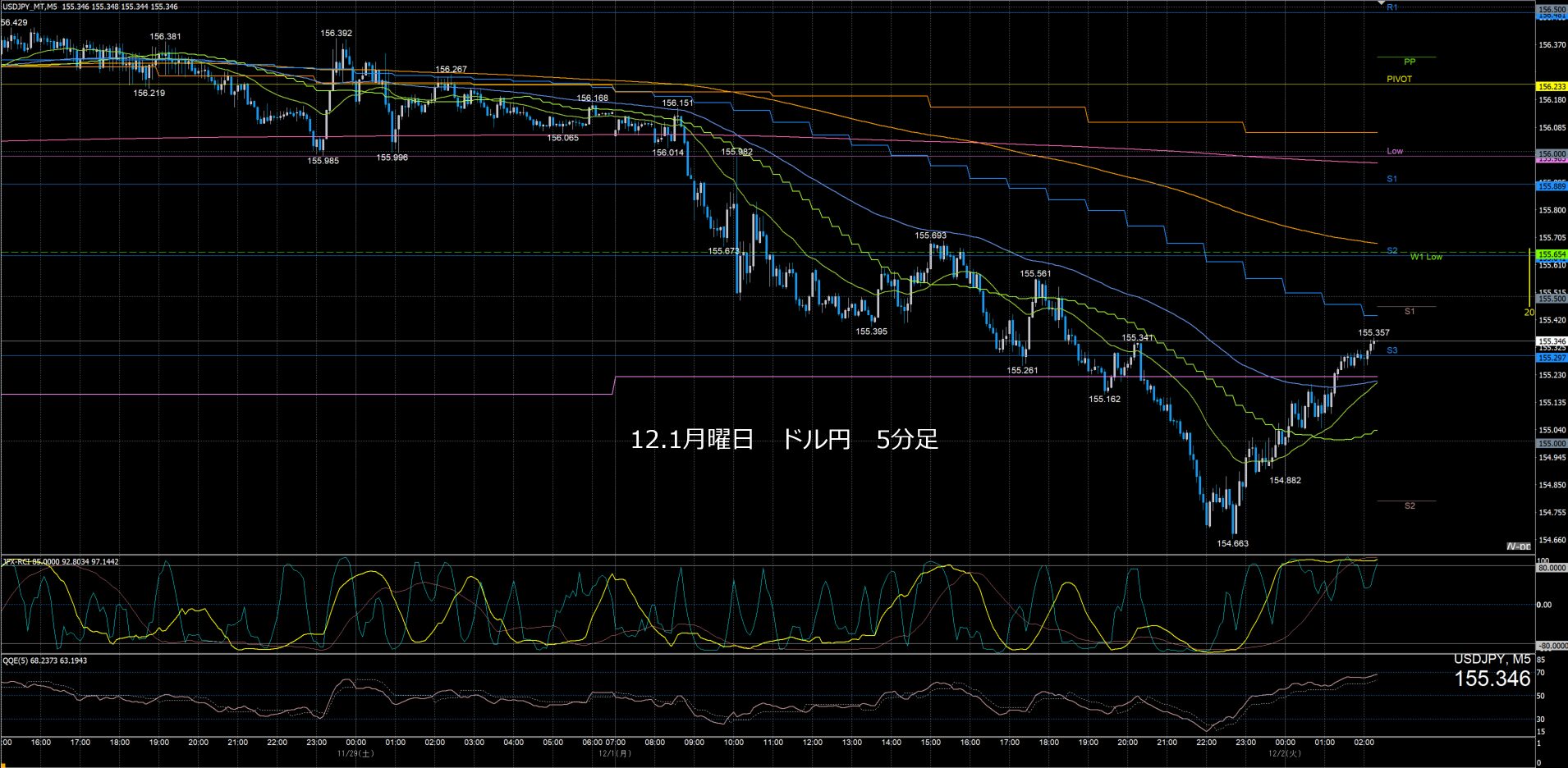 ロンドン時間 ドル円1分足チャート 月曜日 12月1日