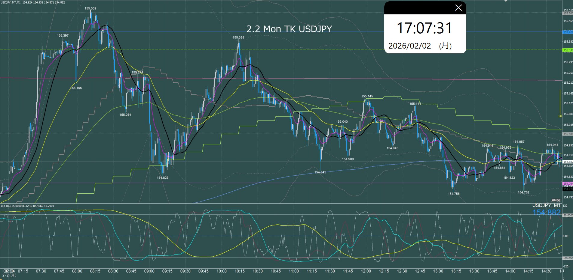 東京時間 ドル円1分足チャート 月曜日 2月2日