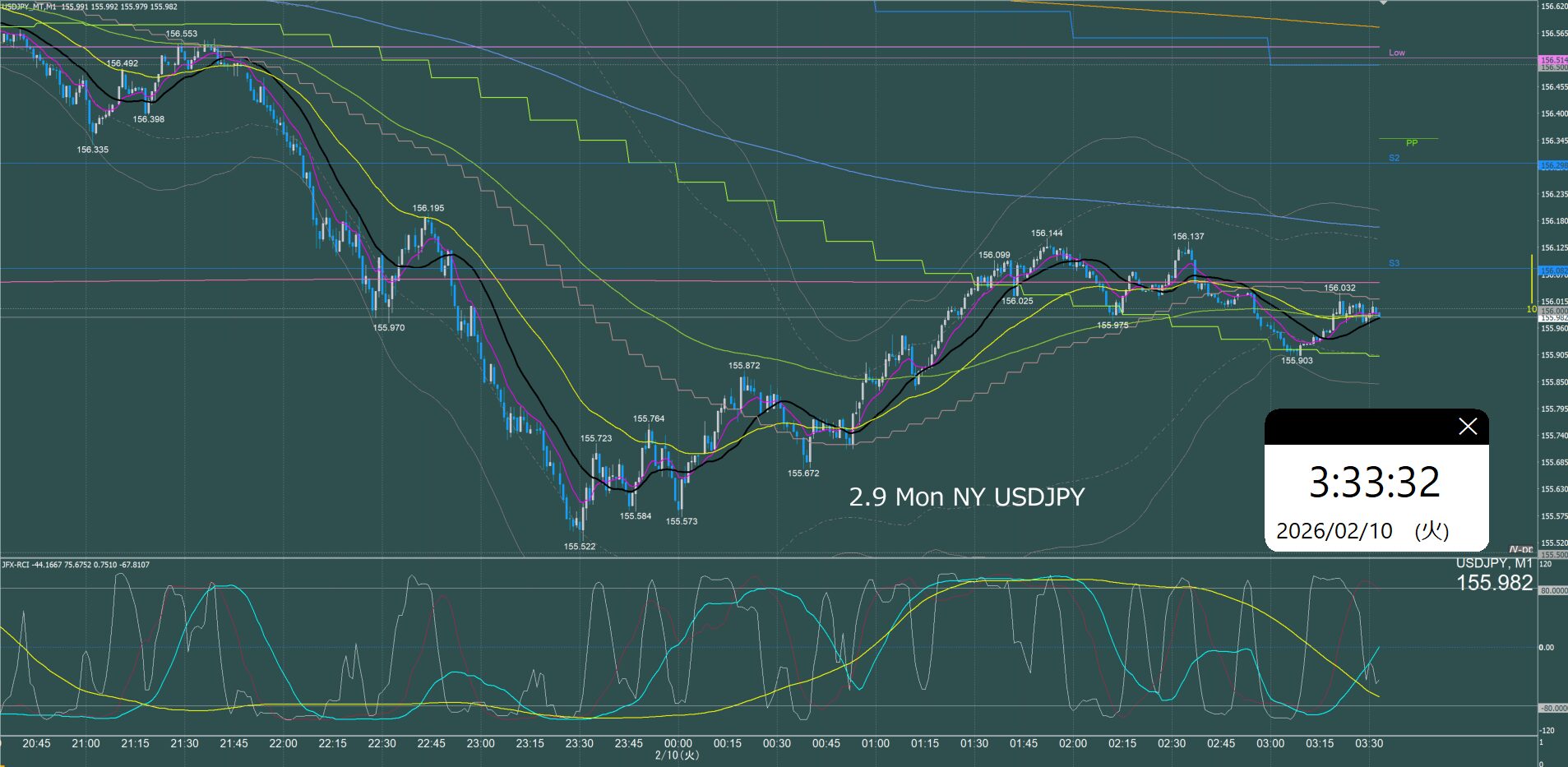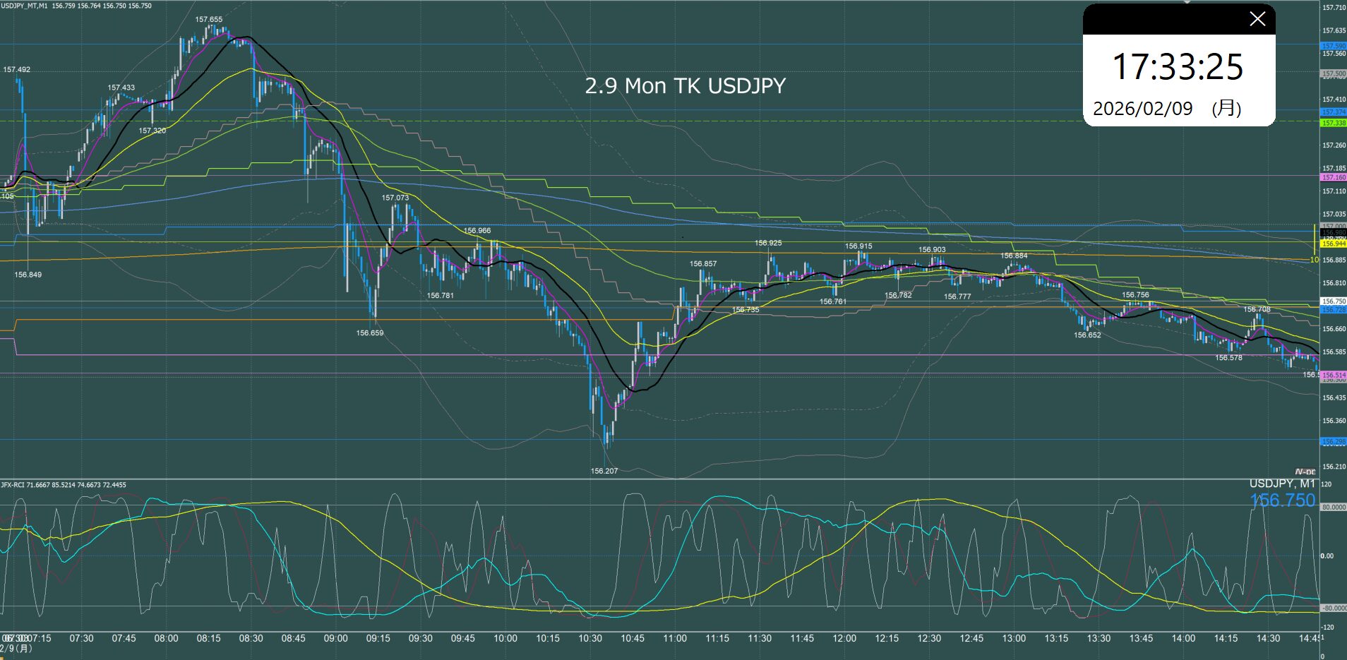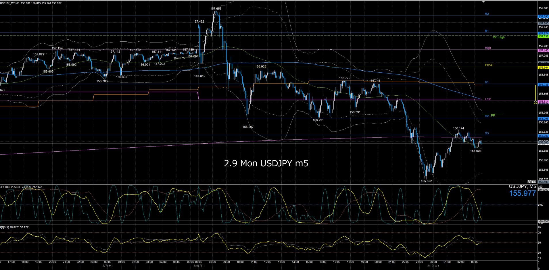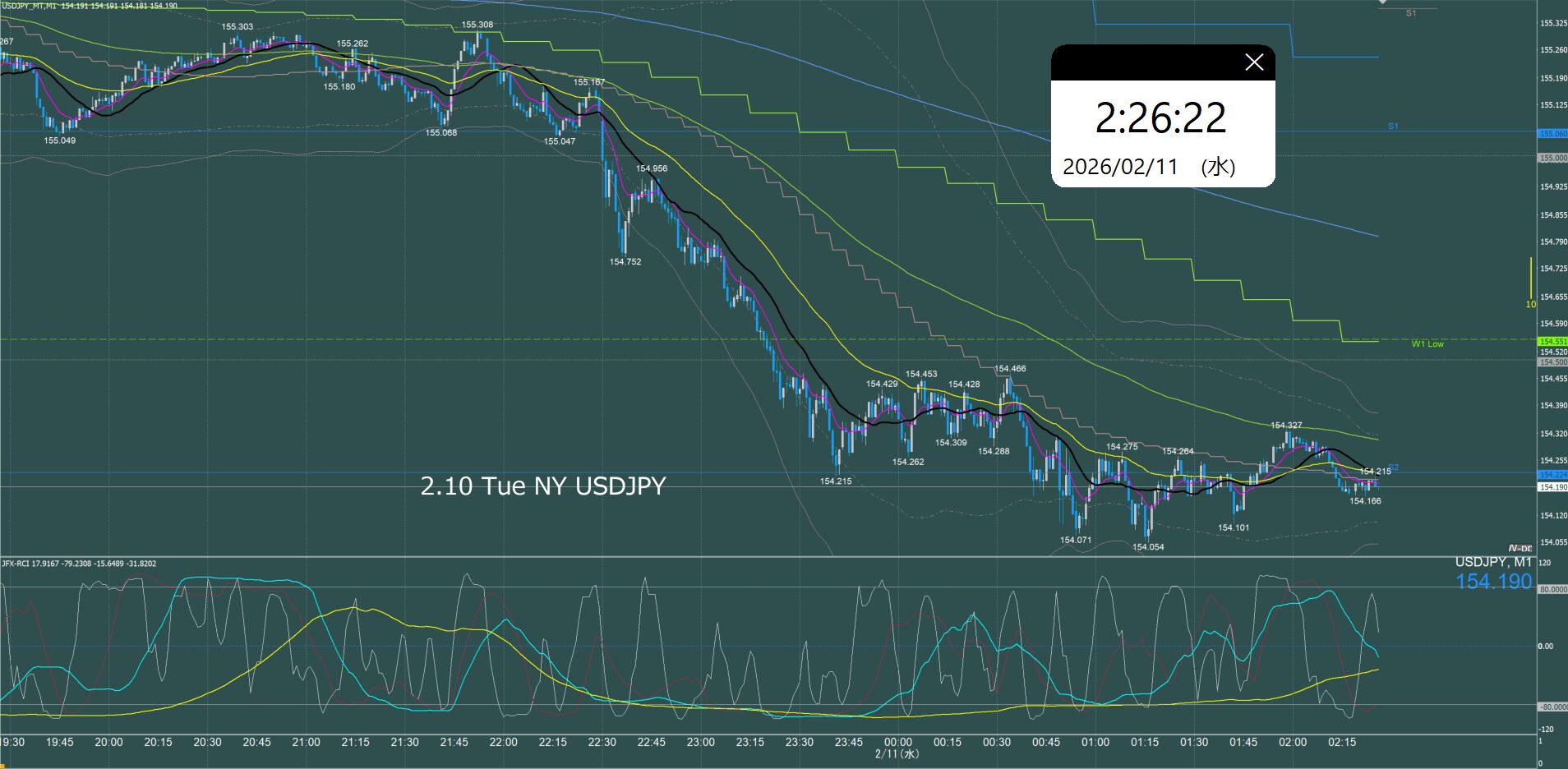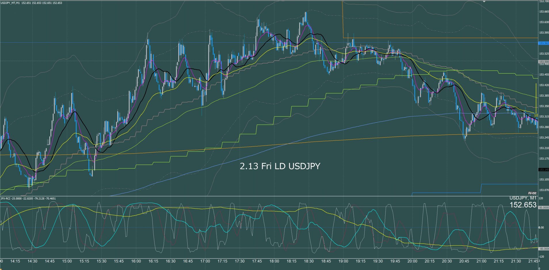 月曜日のオセアニア時間に157.7円まで上げて反転急落、ネックラインが日足SMA21となるダブルトップとなり水曜日まで下降、木曜金曜はレンジでクローズ。