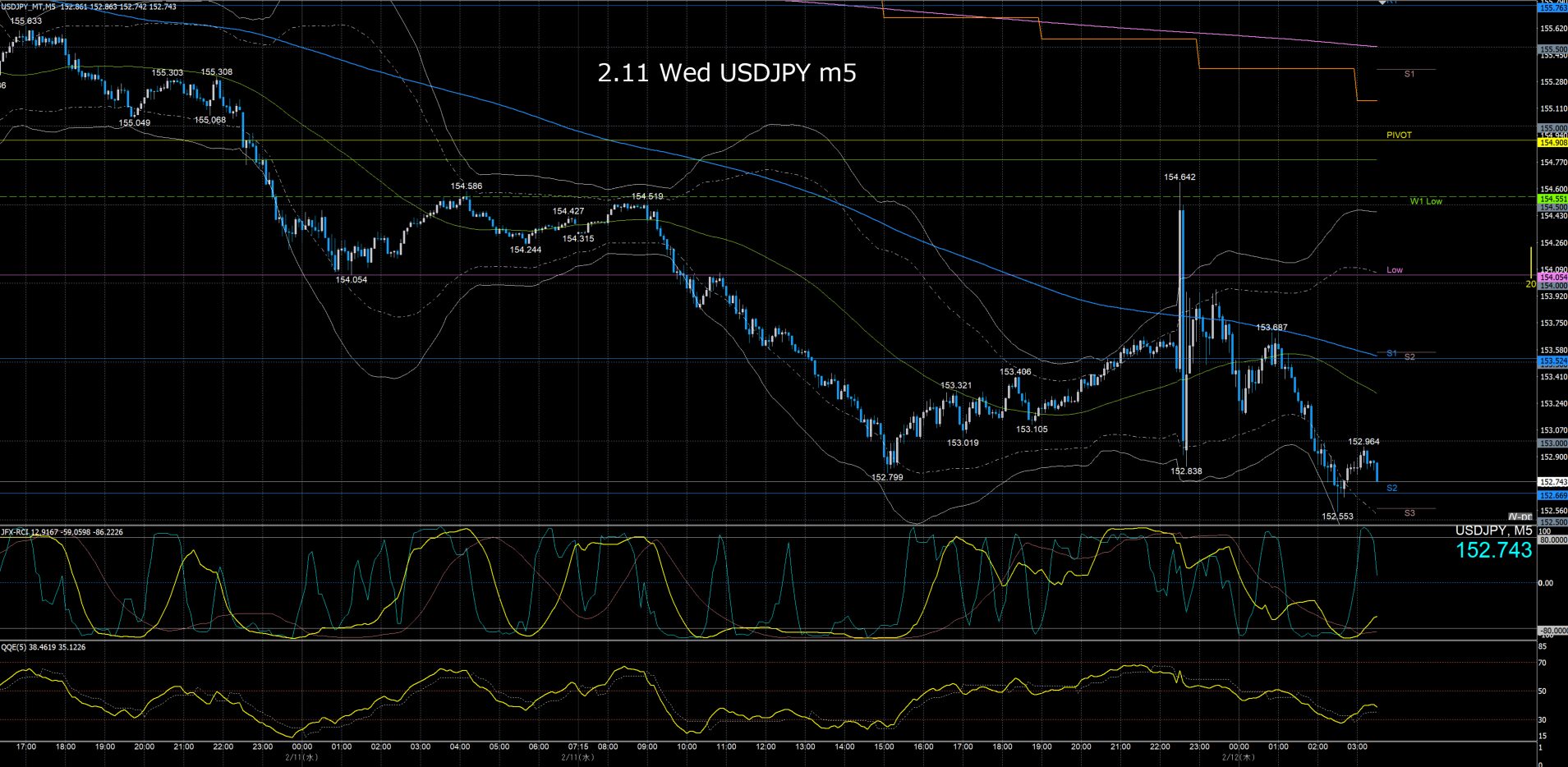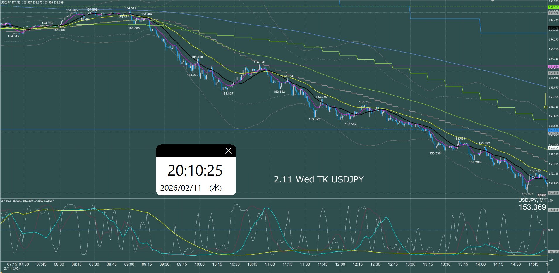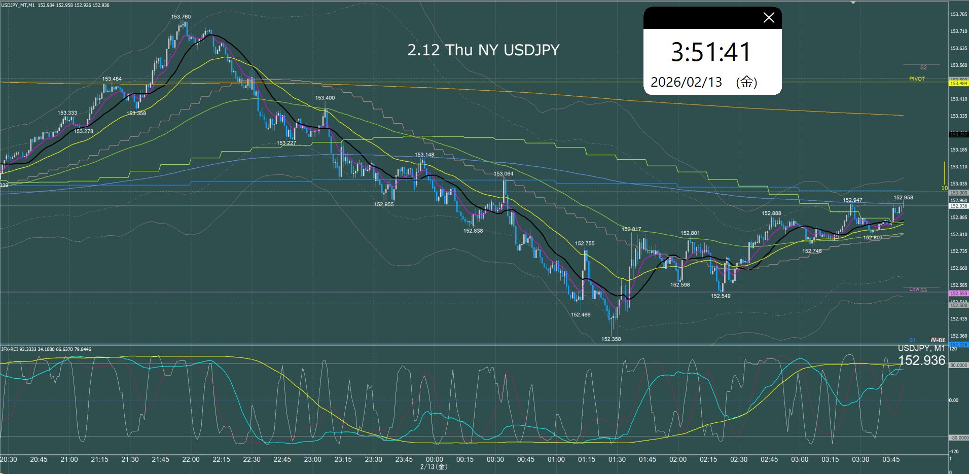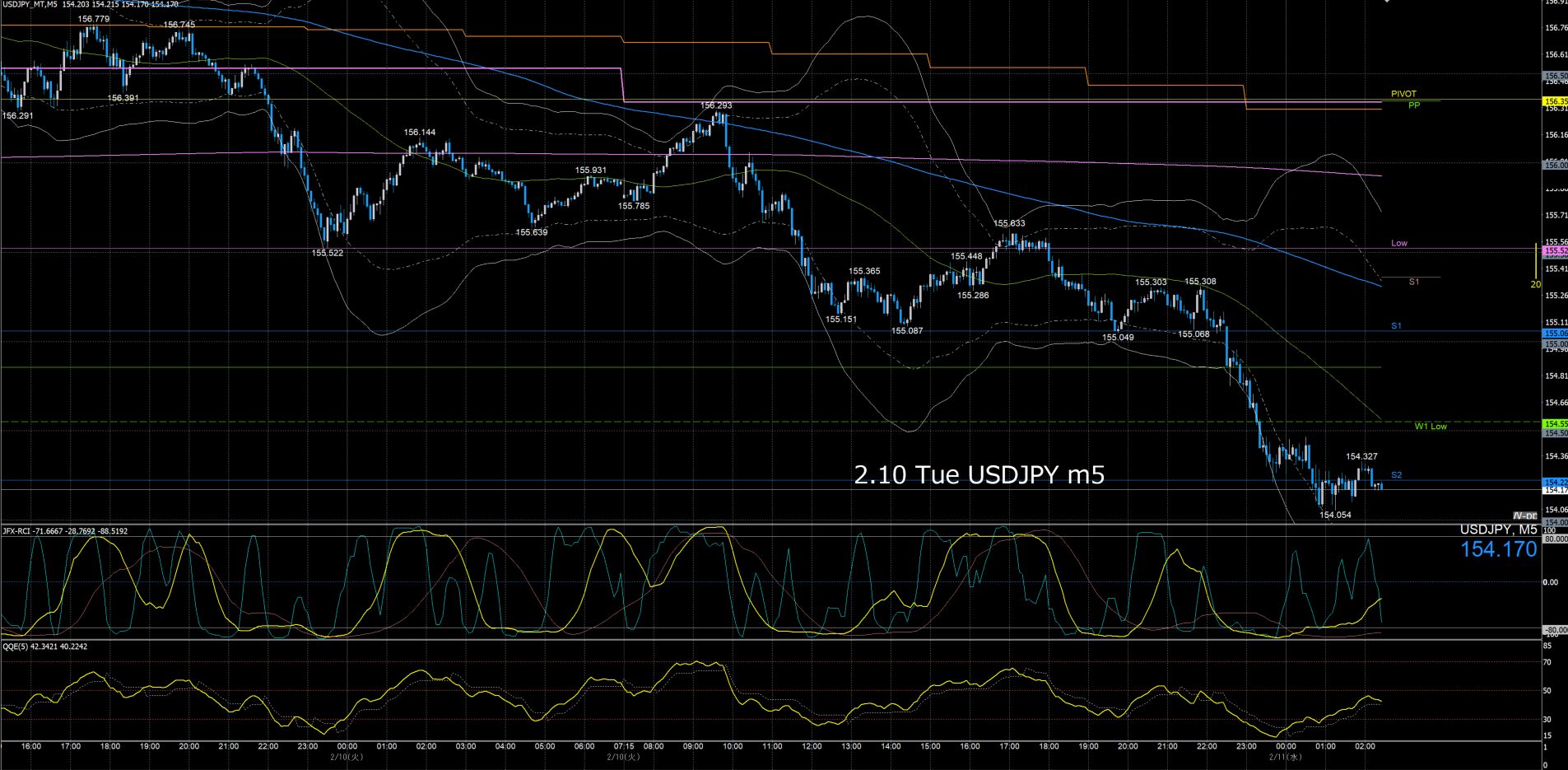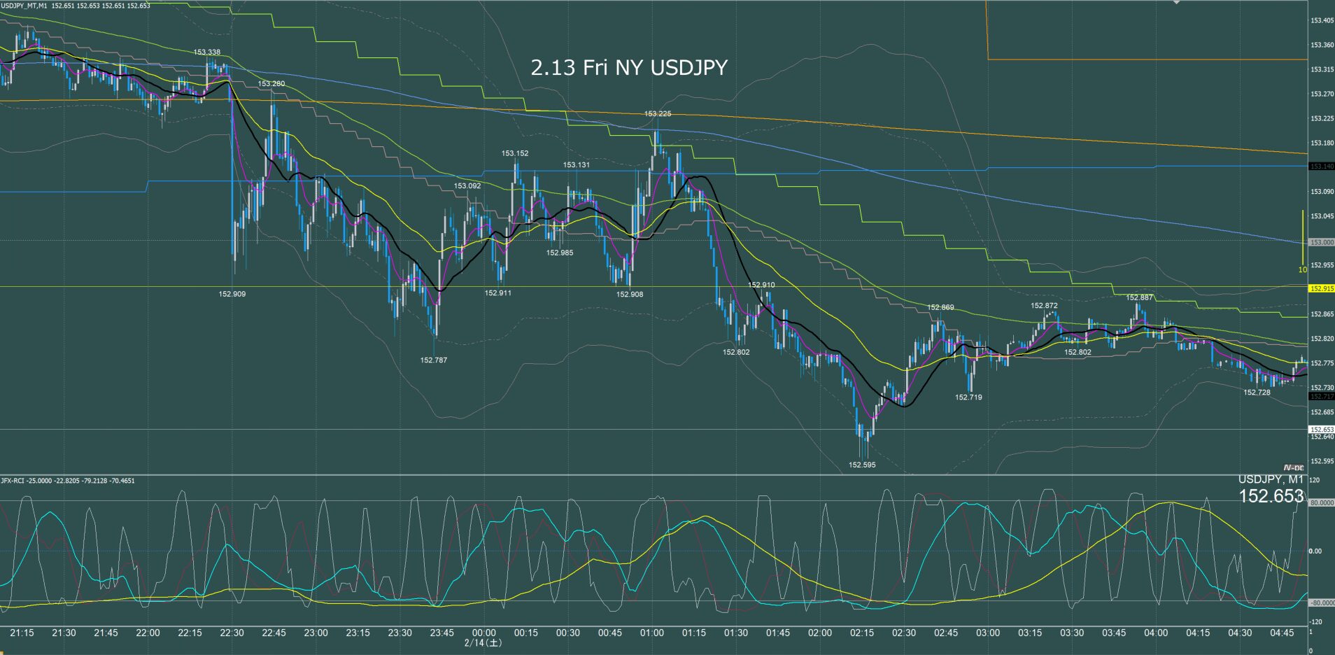 月曜日のオセアニア時間に157.7円まで上げて反転急落、ネックラインが日足SMA21となるダブルトップとなり水曜日まで下降、木曜金曜はレンジでクローズ。
