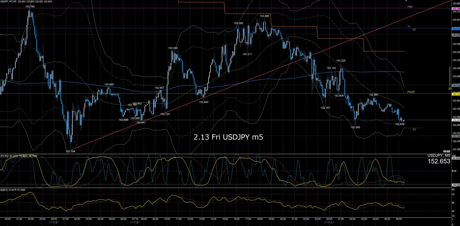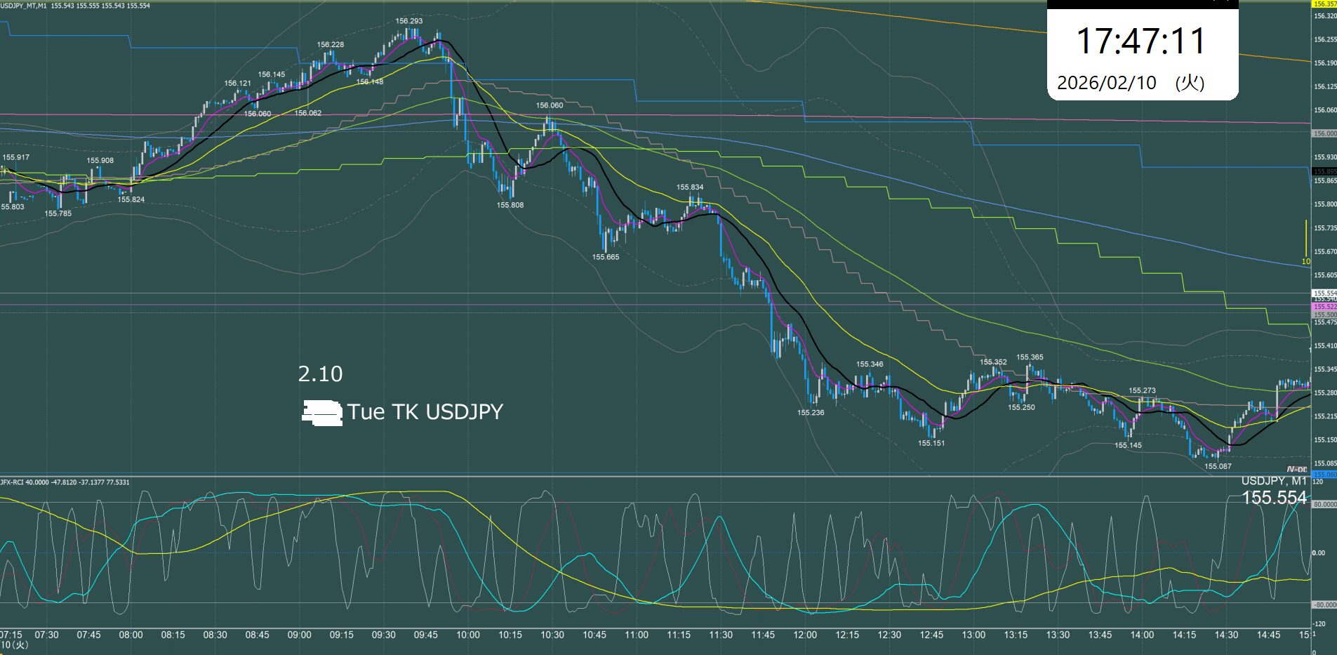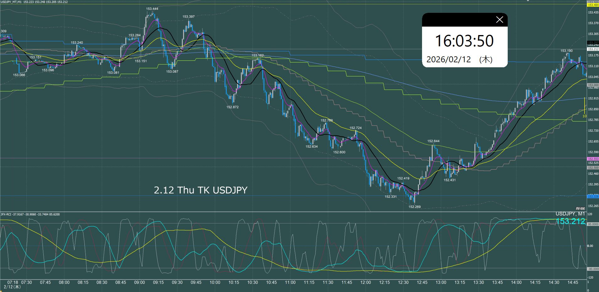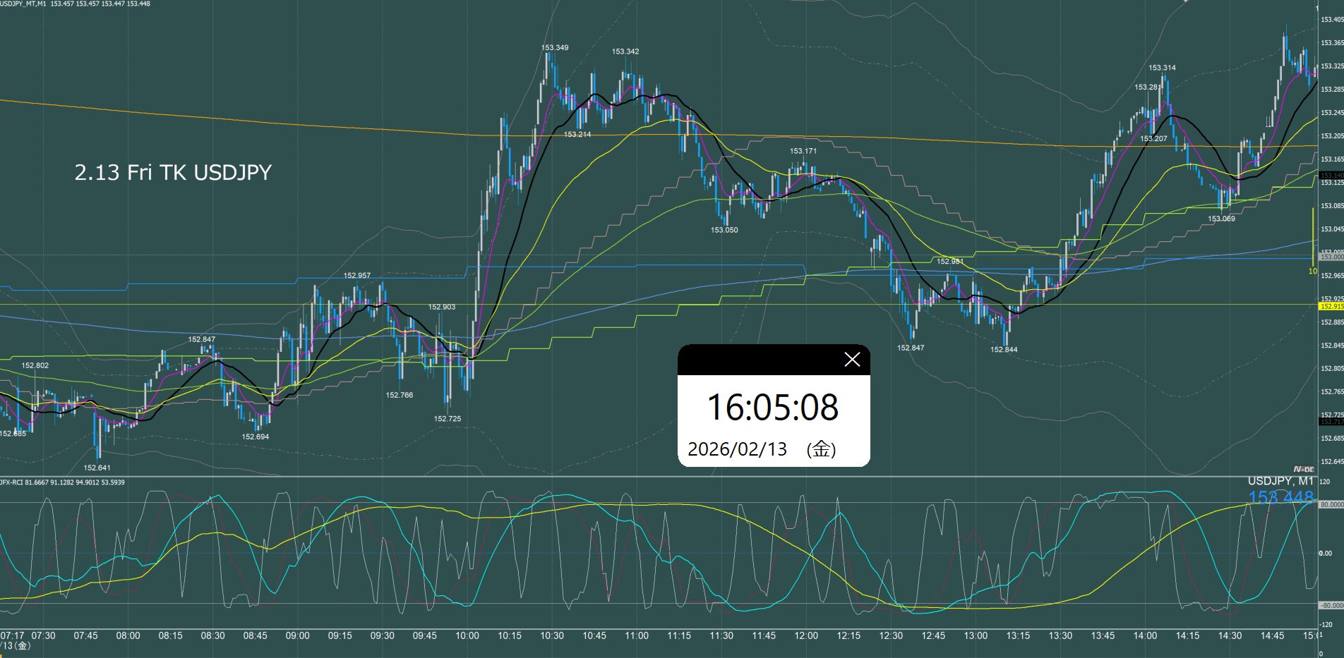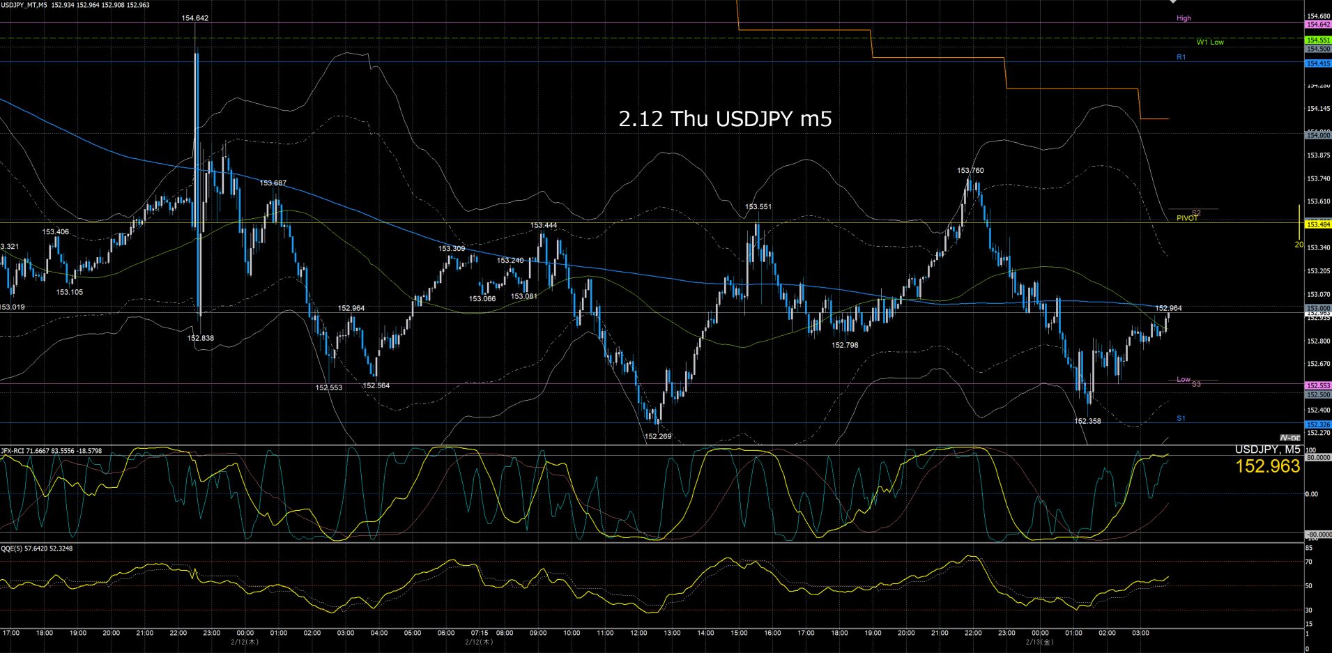 月曜日のオセアニア時間に157.7円まで上げて反転急落、ネックラインが日足SMA21となるダブルトップとなり水曜日まで下降、木曜金曜はレンジでクローズ。